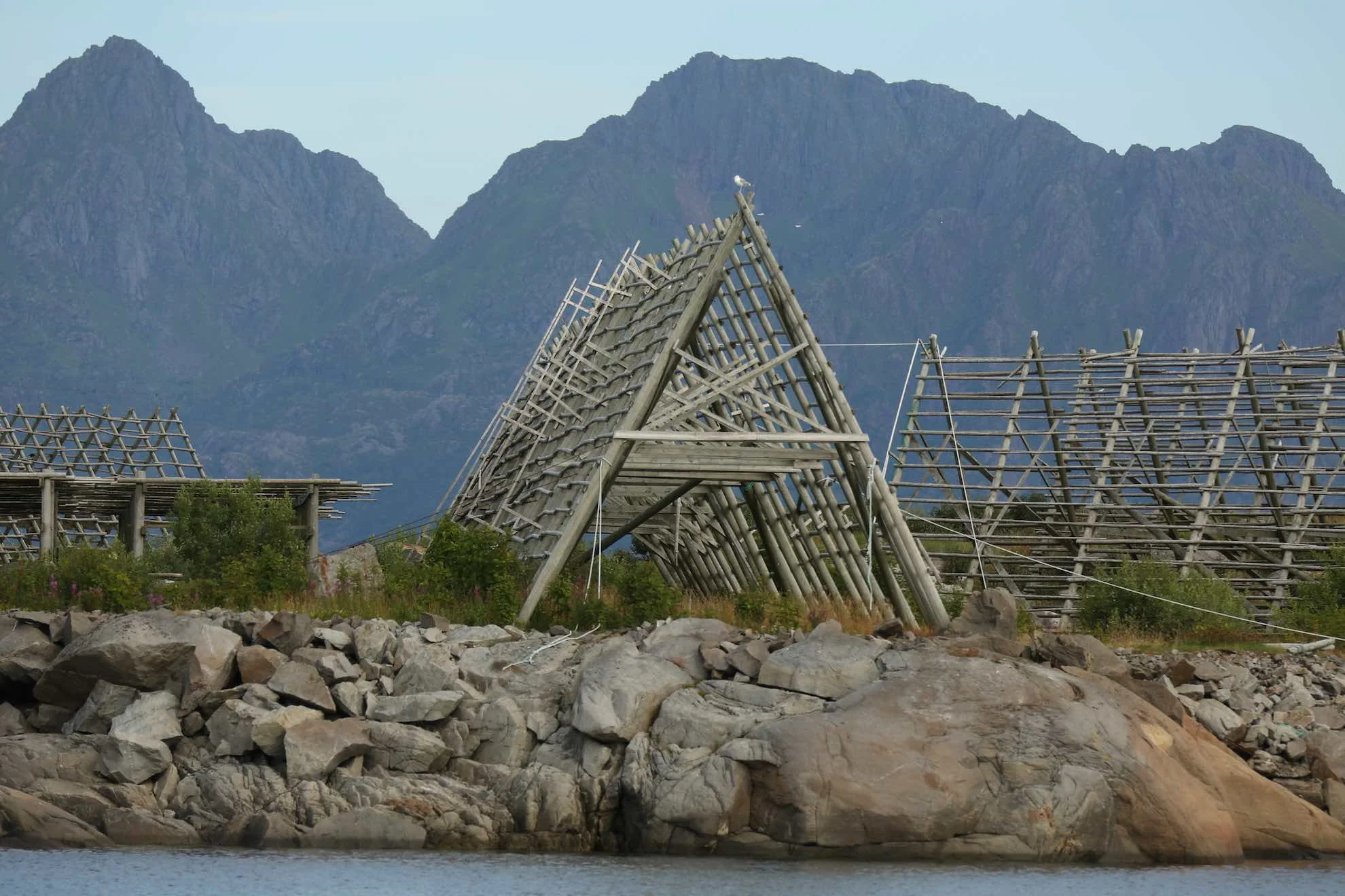 In der Umgebung von Svolvær – auf diesen Gestellen wird in der Fangsaison Kabeljau getrocknet. Svolvær ist die größte Stadt der Lofoten. Die Durchschnittstemperatur im Sommer liegt bei gerade mal rund 14 Grad. Wir sind noch immer im Norden!